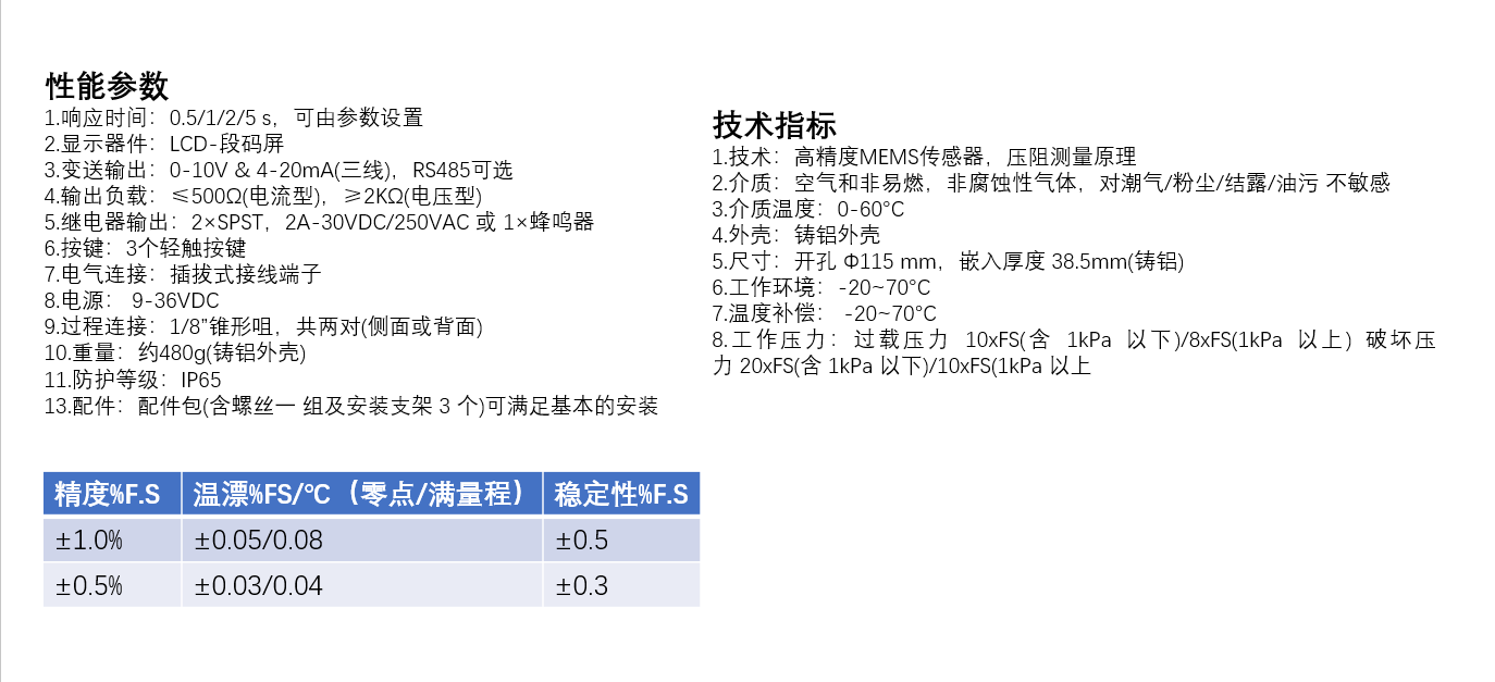 使用段码屏作为表盘显示,数字显示、开关控制和变送器输出功能,可实现压差检测、显示、输出和报警控制的一体化功能,有丰富美观的显示界面。 采用高精度 MEMS 传感器及数字化技术,具有高精度,抗干扰强。 可用于各类净化间、手术室、洁净实验室、生物安全柜、洁 净工作台、医疗和药机等设备的压差检测与控制。 时尚设计,适合嵌入式或盘面安装。 多种量程范围、输出方式、工程单位和报警方式可选。 全数字电路,无机械运动部件,防震动。 精度高达±0.5% FS,量程最低为 25Pa。 按键功能:零位校准、单位切换、继电器设置、响应时间设 置、量程/信号校准等。 高亮度显示,可显示测量值、报警颜色、报警状态、报警设定点等,由按键设置。