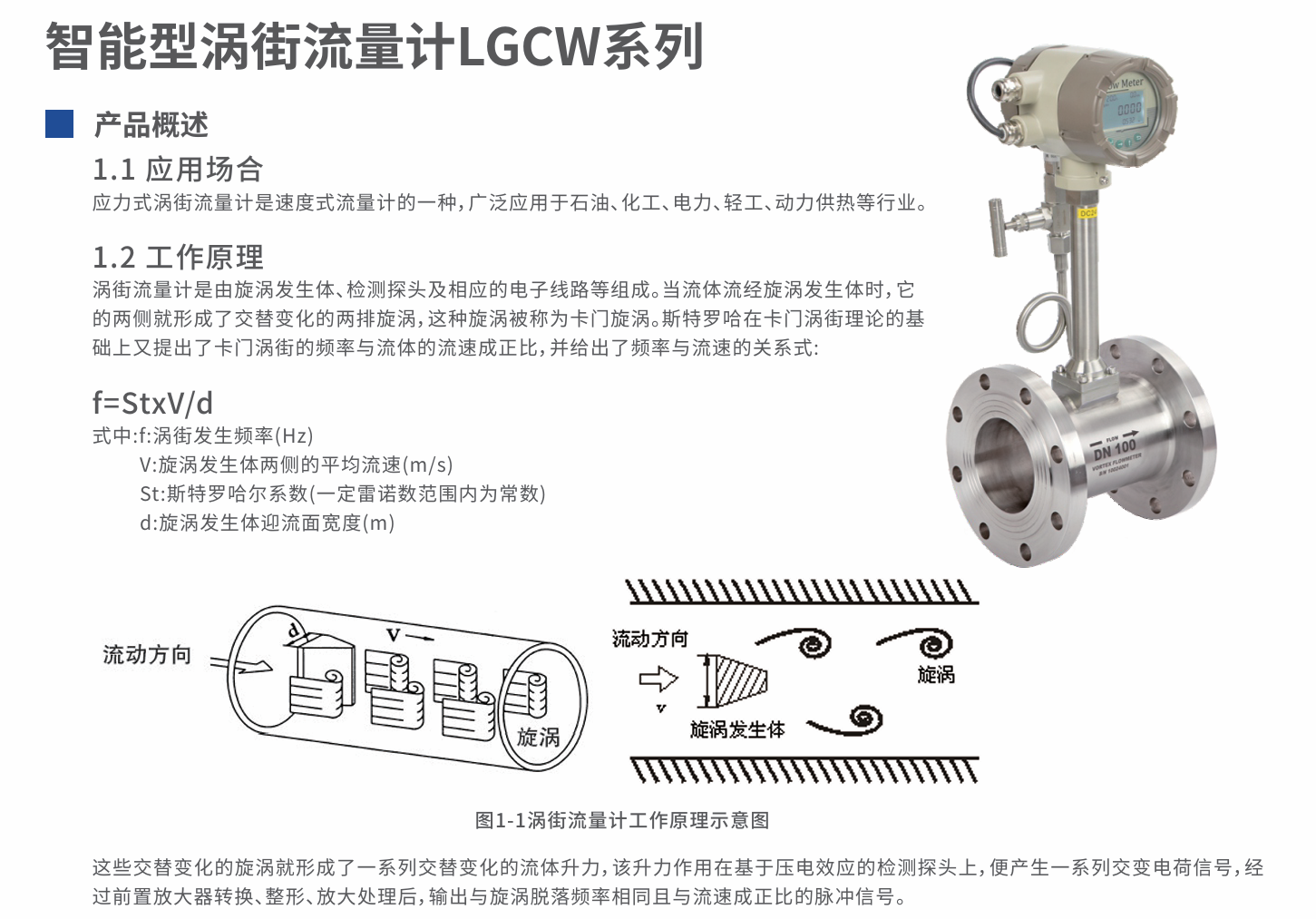 涡街流量计是由旋涡发生体、检测探头及相应的电子线路等组成。当流体流经旋涡发生体时,它的两侧就形成了交替变化的两排旋涡,这种旋涡被称为卡门旋涡。